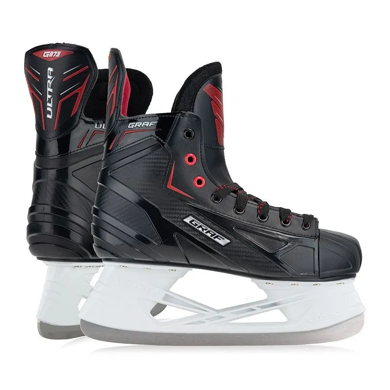 Эта модель младшая в линейке «семьдесят пятых», но пусть вас не смущает её простота. Этот ботинок, как и вся линейка, получил анатомическую колодку, повторяющую рельеф строения ноги человека что сделало их одними из самых комфортных хоккейных коньков. В Graf Ultra G875 Venom Pro не предусматривается принудительная термоформовка с разогревом в печи, но благодаря меньшей массе используемого материала ботинок получил лёгкий вес, на уровне более старших и профессиональных моделей.