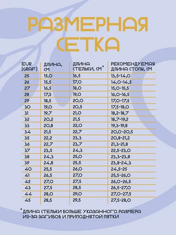| EUR (Graf) | Длина стопы, см. | Длина стельки, см |