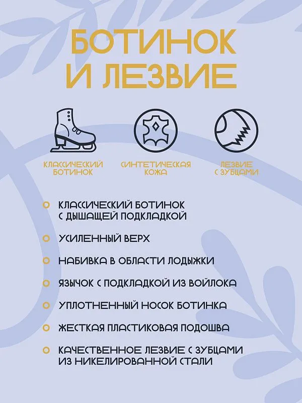 Классический ботинок сделан из прочной синтетической кожи с дышащей подкладкой, плотно облегает ногу и поддерживает голеностопный сустав. Усиленный верх, набивка в области лодыжки и язычок с подкладкой из войлока обеспечивают лучший комфорт. А уплотненный носок ботинка и жесткая пластиковая подошва защитят стопу от повреждения. Лезвие с зубцами выполнено из качественной никелированной стали, прочно крепится к подошве винтами.