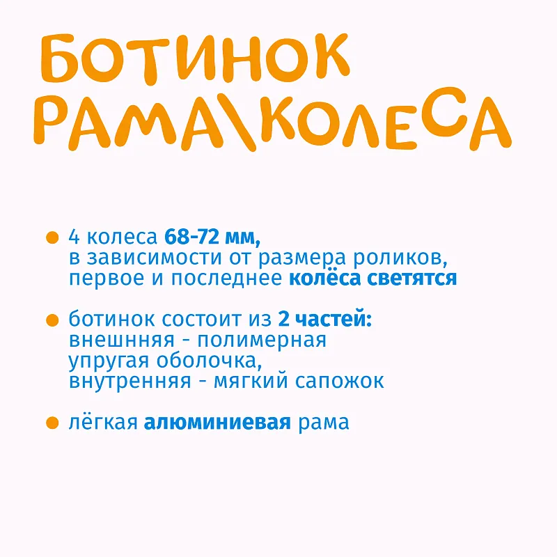 Скорость. Основа ходовой части – рама, сделана из алюминия, что позволяет легко набирать и удерживать скорость, а так же положительно сказывается на снижении веса всей пары. Колёса с мягкой полиуретановой шиной на скоростных подшипниках класса ABEC-7 катятся мягко и бесшумно, а плотность их материала даёт прекрасное сцепление с поверхностью. В зависимости от размера, ролики комплектуются колёсами диаметром 68, 70 или 72 мм. К тому же первое и последнее колесо при вращении – светятся!