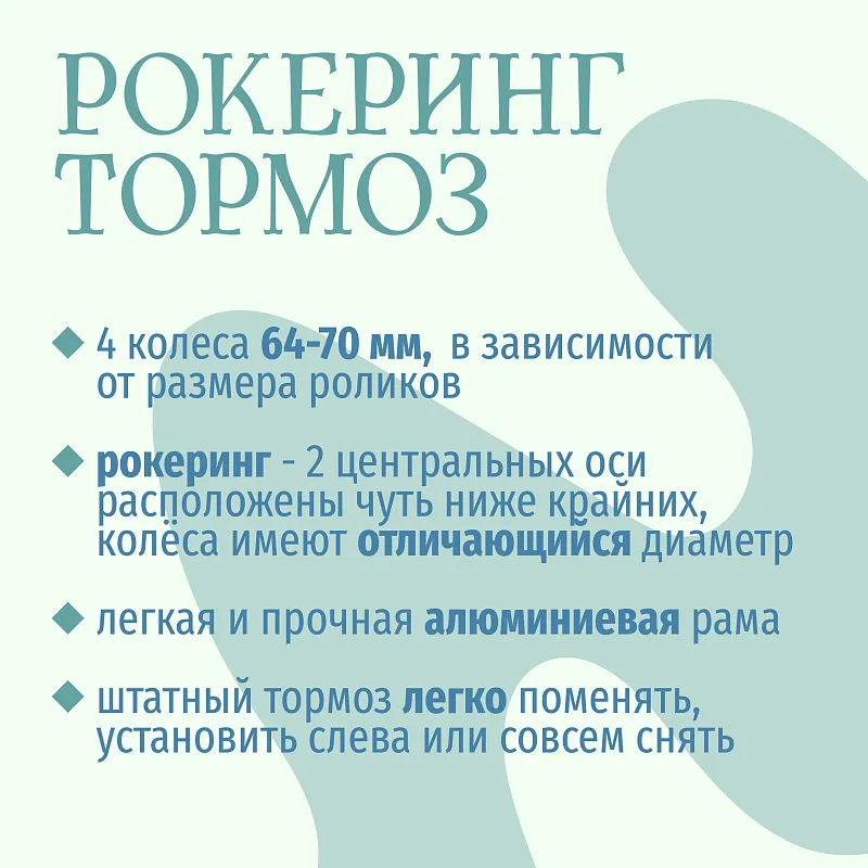 Для стабильного выполнения трюков важны скорость, отдача и манёвренность ходовой части. Именно для этого, при изготовлении рамок, удерживающих колёса, и применяют экструдированный дюралюминиевый профиль. Рама получается очень лёгкой и прочной, а трансфер энергии повышается. Для повышения маневренности рамы получили рокеринговую постановку колёс – две центральных оси расположены чуть ниже крайних, а сами колёса имеют отличающийся диаметр*. В зависимости от того куда вы переставите колёса ролики будут опираться либо на два, либо на все четыре колеса. Такая конструкция позволяет выбирать между более высокой скоростью и устойчивостью, либо более высокой подвижностью и контролировать траекторию движения с миллиметровой точностью!
