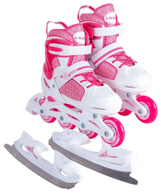 Детские ролики + коньки TechTeam Laura - раздвижная модель с возможностью заменить раму с колёсами на лезвие для катания зимой. Композитная рама оборудована колесами 64, 70 или 72 мм в зависимости от размера. Лезвие из нержавеющей стали с заводской заточкой.