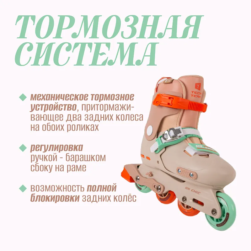 Сберегите свои нервные клетки. Ролики Tech Team On Chic 2024 снабжены механическим тормозным устройством, притормаживающим два задних колеса на обоих роликах, так, что бы знакомясь с новой для себя техникой движения, ребёнок мог бы чувствовать себя в безопасности. Вы просто делаете несколько вращений удобной ручкой-барашком, расположенной сбоку рамы объединяющей колёса, и у ребёнка уже не будет возможности неконтролируемо разгоняться, а ролики не будут выскакивать из под ребёнка при неосторожном движении! Если этого мало, вы вольны заблокировать вращение задних колёс полностью, дав ребёнку возможность просто ходить в этих роликах как в ботинках, привыкая к новым ощущениям! Классно? Мы тоже так считаем! Но что там ещё?