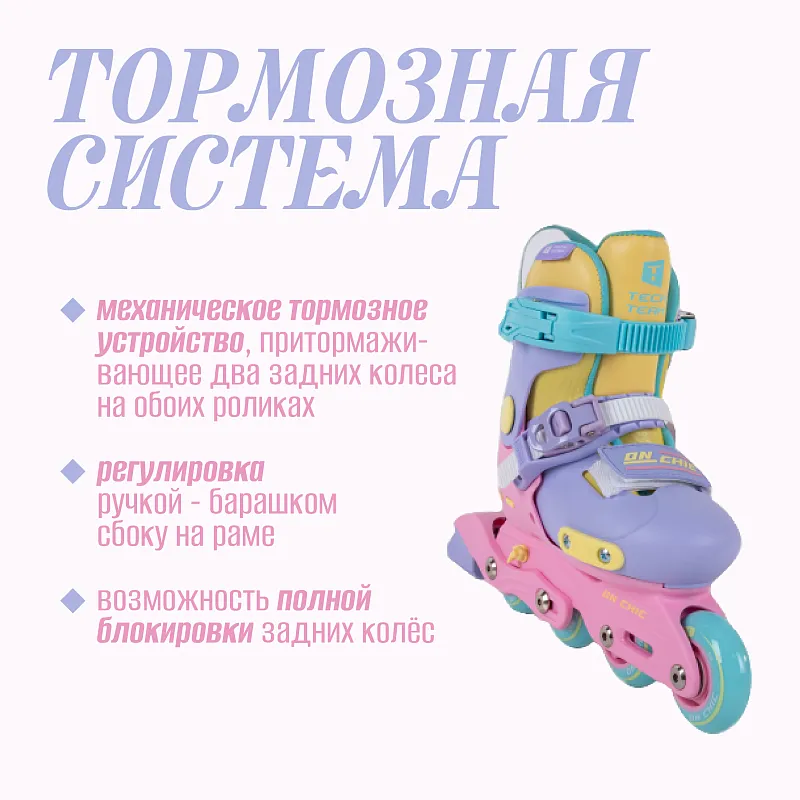 Сберегите свои нервные клетки. Ролики Tech Team On Chic 2024 снабжены механическим тормозным устройством, притормаживающим два задних колеса на обоих роликах, так, что бы знакомясь с новой для себя техникой движения, ребёнок мог бы чувствовать себя в безопасности. Вы просто делаете несколько вращений удобной ручкой-барашком, расположенной сбоку рамы объединяющей колёса, и у ребёнка уже не будет возможности неконтролируемо разгоняться, а ролики не будут выскакивать из под ребёнка при неосторожном движении! Если этого мало, вы вольны заблокировать вращение задних колёс полностью, дав ребёнку возможность просто ходить в этих роликах как в ботинках, привыкая к новым ощущениям! Классно? Мы тоже так считаем! Но что там ещё?
