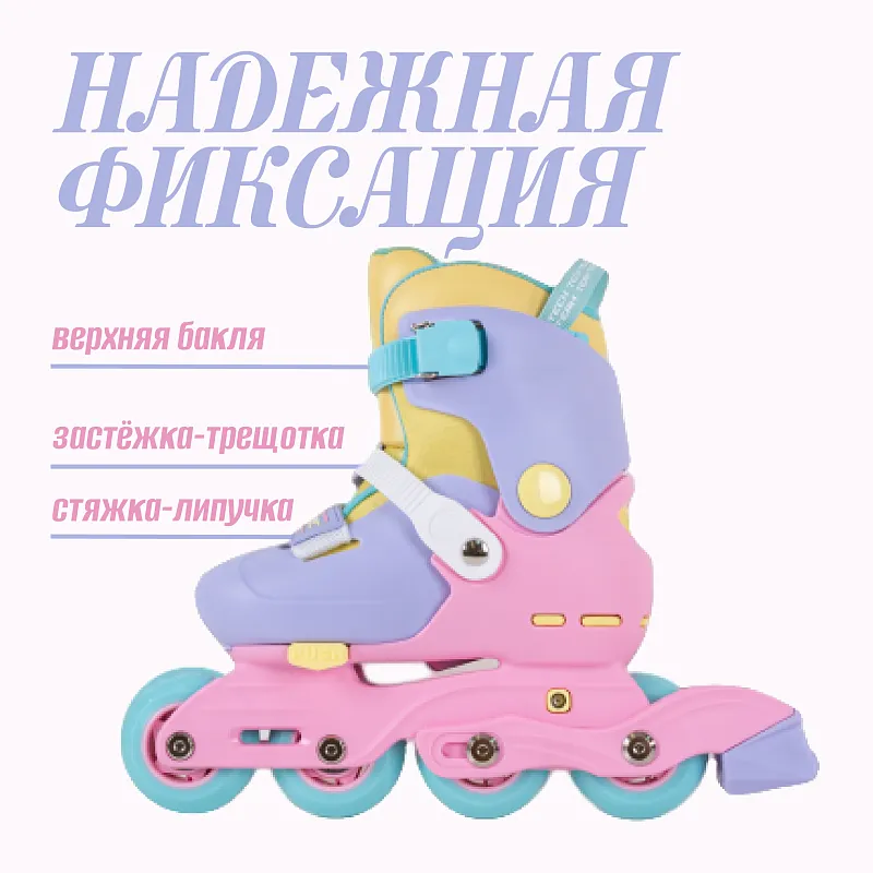 А ещё решён извечный вопрос со шнурками, ведь любой родитель знает, как непросто малышу с ними справляться. А если ребёнок занимается в секции, где вынужден справляться с надеванием роликов самостоятельно, нет гарантий, что у малыша получиться зафиксировать ролики на ноге вполне надёжно и удобно. По этому шнурков на этих ботинках… Нет! Вместо них есть поперечная стяжка на липучке-велкро на уровне стопы, застёжка трещотка (пяточная «бакля») на лодыжке, надёжно охватывающая голеностоп снизу и фиксирующая пятку на каблуке, и верхняя застёжка- «бакля» на голенище, всё совсем как на взрослых спортивных моделях!