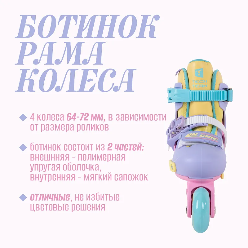 Представляем вам новую линейку раздвижных роликовых коньков для детей Tech Team On Chic 2024! Это свежая модель, которая призвана подарить удовольствие от катания на роликовых коньках тем, кто только делает первые шаги в этой активности. Традиционно для детских моделей, ботинок этих роликов, умеет расти вместе с ребёнком, увеличиваясь и раздвигаясь в сторону мыса на три размера, этого должно хватить на два активных сезона катания. Так же, что бы была возможность выбрать оптимальный диапазон исходя и фактического размера ноги, эта модель представлена в трёх размерных диапазонах: 28-31, 32-35 и 36-39. Но так делают ролики все известные бренды, а что же здесь нового? Принципиально всё!