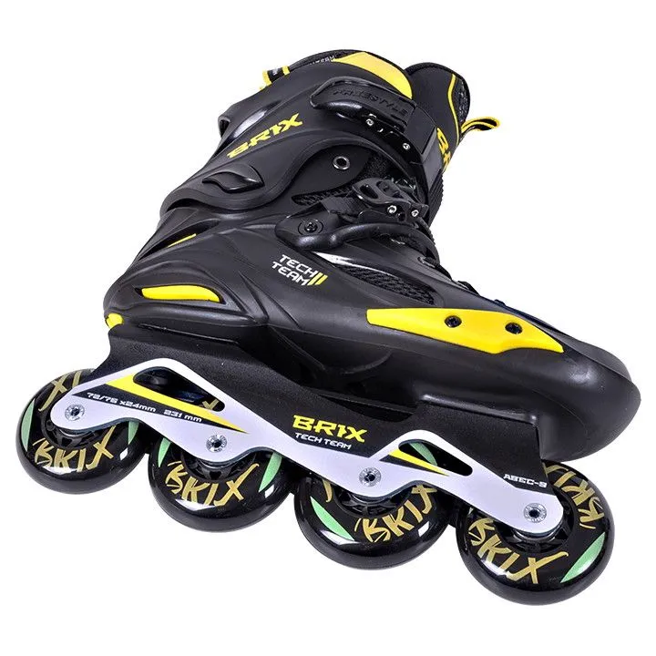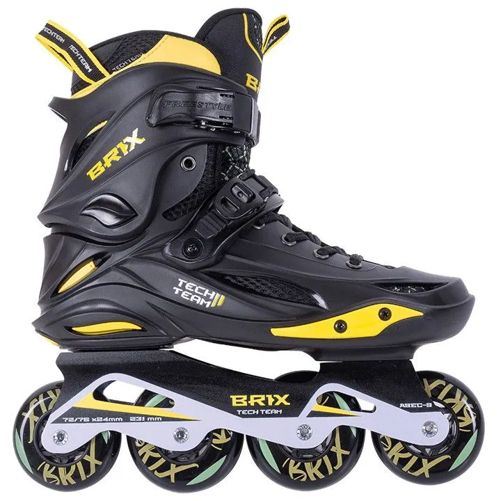 Для наиболее комфортного занятия такими дисциплинами как стайл- или скоростной слалом, Tech Team Brix оснащены короткой спортивной рамой, для большей жёсткости сделанной из цельного алюминиевого профиля методом фрезеровки. Длина рамы соответствует размеру ботинка – на размерах 35-38 она короче (231 мм/72-76мм), а на размерах 40-44 длиннее (243 мм/76-80 мм). Колёса уже с завода выставлены в рокеринг – подобраны по диаметру так, чтобы первое и последнее колесо были меньшего диаметра и не касались бы поверхности. Такая постановка колёс улучшит маневренность и точность выполнения фигур.