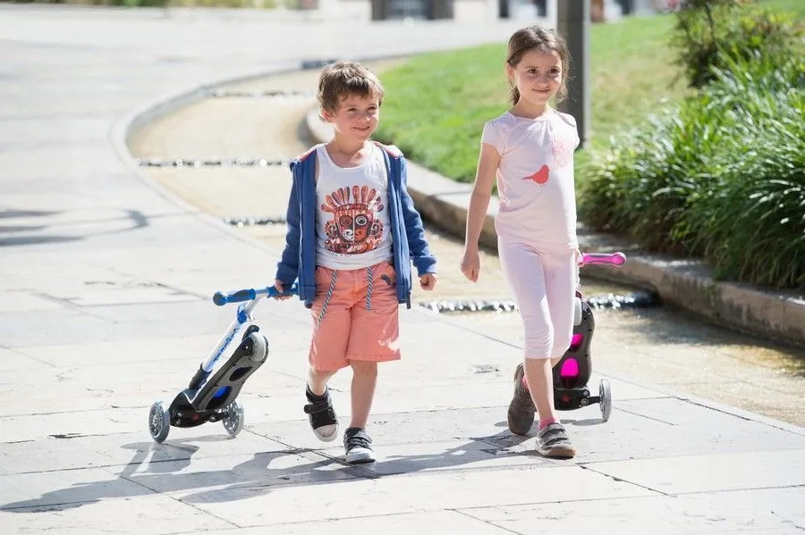 Основной плюс данной модели - удобная транспортировка - если юный райдер устал, он сможет сложить самокат и везти его за собой. В сложенном состоянии самокат легко помещается в багажник машины или чехол для переноски. Усиленная платформа теперь выдерживает большие нагрузки - вплоть до 50 kg. Регулируемый телескопический руль имеет 4 положения: 60/68/73/78 см., материал изготовления руля - 100% авиационный алюминий. Простой и надежный механизм складывания: нужно нажать кнопку, немного вытянуть ручку и повернуть ее параллельно платформе до щелчка. На каждом самокате указана точная дата его производства.