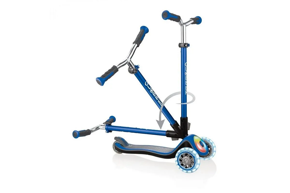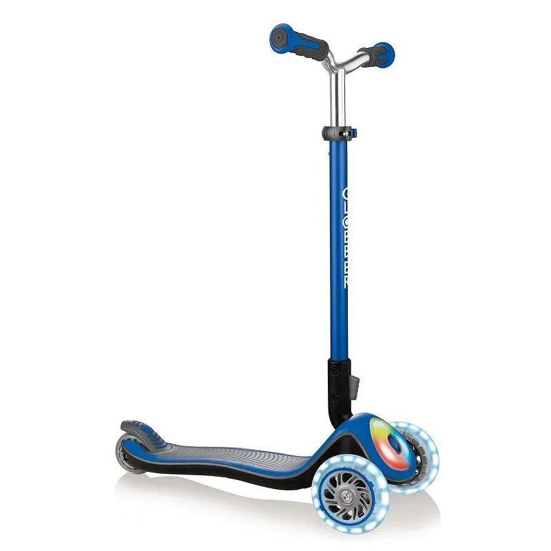 Globber Elite Prime - это складной трехколесный самокат для детей от 3 лет, укомплектованный светящимися колёсами и передней платформой для безграничного веселья вашего ребенка! Самокат идеально подходит для развития равновесия и обучения езде вашего малыша. ELITE PRIME обладает цветным анодированным V-образным рулем, который регулируется на 4 уровня высоты и легко адаптируется к росту ребенка.