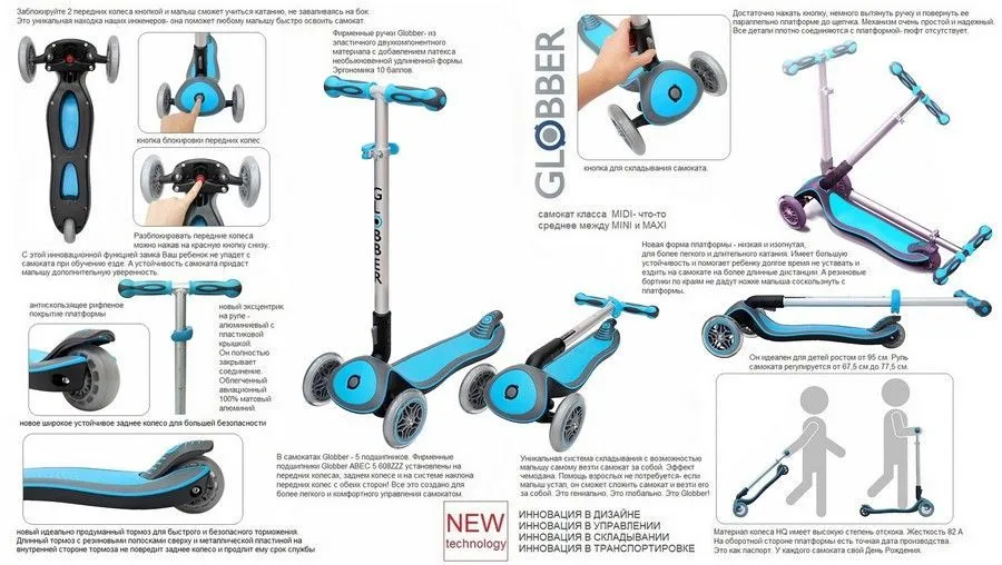 Globber Elite S My Free Fold up Sky Blue - подойдет для детей от 3 лет и старше. Модель 2017 года "Элит С" - по сравнению со своим предшественником "Глоббер май фри ап" этот самокат получил ряд улучшений: