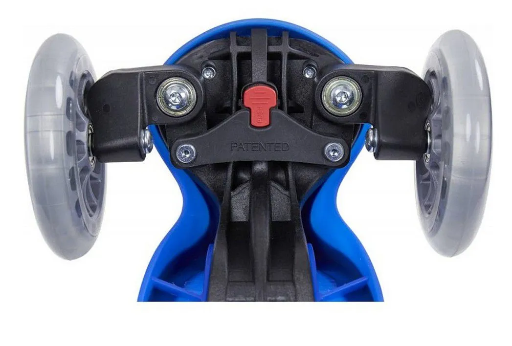 Передние колеса имеют диаметр 121 мм., заднее опорное колесо диаметром 80 мм. Колеса изготовлены из высококачественного полиуретана, комплектуются подшипниками ABEC 5. Высота руля имеет 4 фиксированных положения, регулируется от 61 до 71 см. Опоры передних колес монтированы на подшипниках для облегчения управления самокатом. Эргономичные ручки руля из эластичного материала с добавлением латекса. Торможение с помощью заднего крыла-тормоза. Специальное покрытие заднего колеса для предотвращения деформации при торможении.