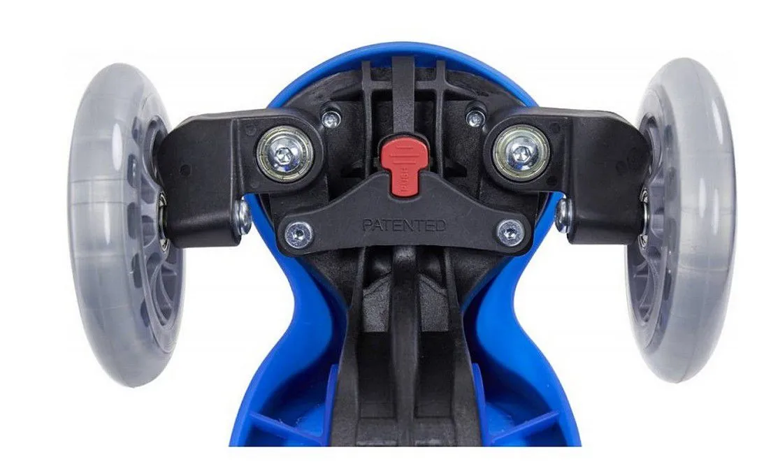 Передние колеса имеют диаметр 121 мм., заднее опорное колесо диаметром 80 мм. Колеса изготовлены из высококачественного полиуретана, комплектуются подшипниками ABEC 5. Высота руля имеет 4 фиксированных положения, регулируется от 61 до 71 см. Опоры передних колес монтированы на подшипниках для облегчения управления самокатом. Эргономичные ручки руля из эластичного материала с добавлением латекса. Торможение с помощью заднего крыла-тормоза. Специальное покрытие заднего колеса для предотвращения деформации при торможении.