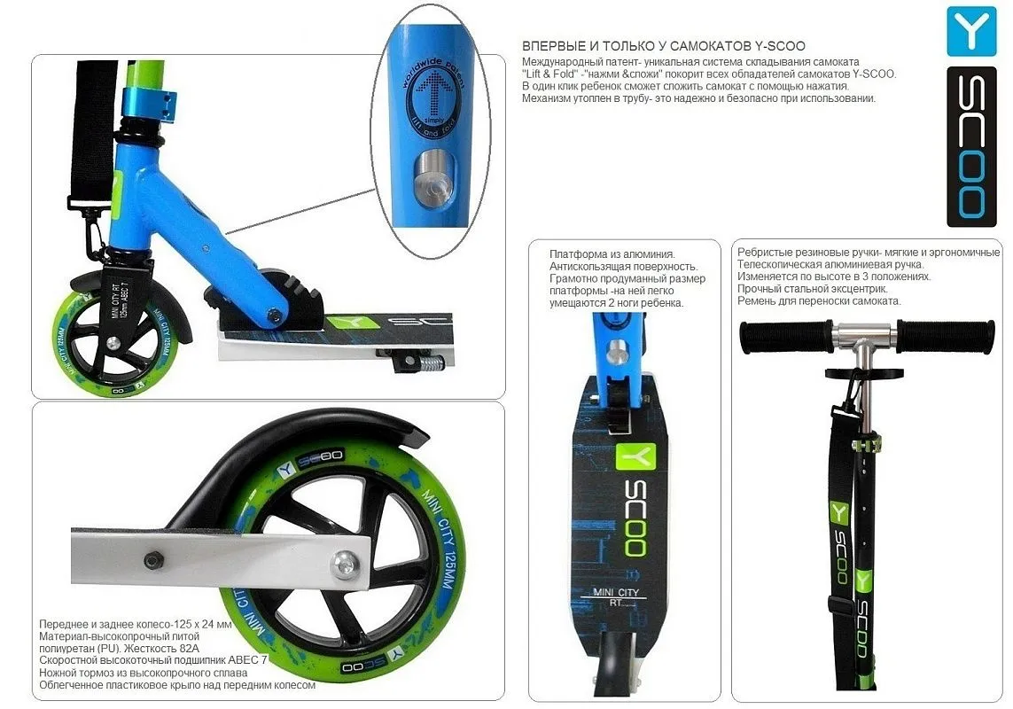 Складной механизм прост и надёжен. Система складывания Lift and Fold позволяет сложить и разложить самокат за несколько секунд не прибегая к большим усилиям. Руль регулируется по высоте в диапазоне 72 - 94 см от земли или 65 - 87 см от площадки и имеет 3 фиксированных положения. Максимально возможной высоты хватает для удобного использования взрослыми до 160 см. Да, Y-scoo City 125 Montreal может стать семейным транспортом. Максимальная нагрузка - 100 кг. Ширина ручек хорошо подобрана именно для детского использования. Хват будет удобным и руки не придётся широко расставлять.