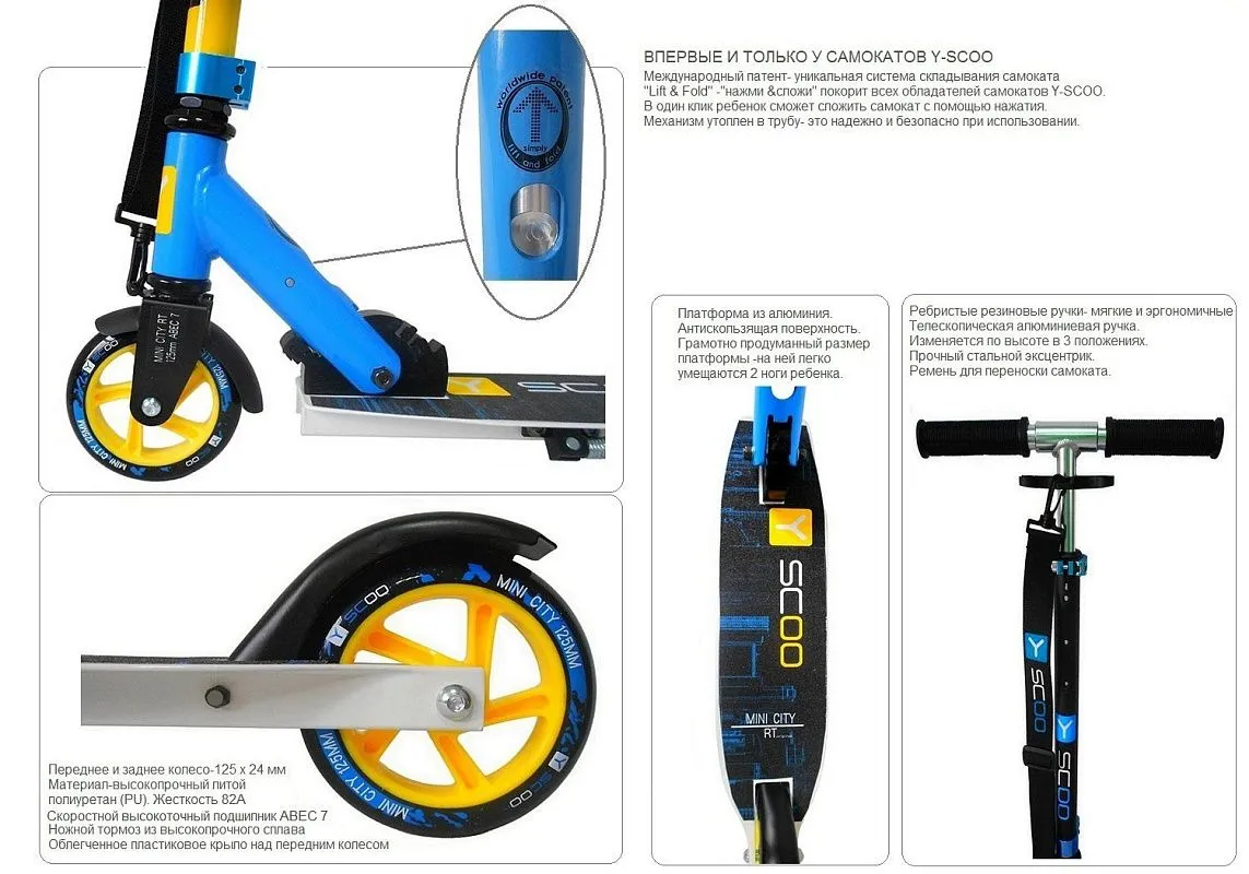 Складной механизм прост и надёжен. Система складывания Lift and Fold позволяет сложить и разложить самокат за несколько секунд не прибегая к большим усилиям. Руль регулируется по высоте в диапазоне 72 - 94 см от земли или 65 - 87 см от площадки и имеет 3 фиксированных положения. Максимально возможной высоты хватает для удобного использования взрослыми до 160 см. Да, Y-scoo City 125 Montreal может стать семейным транспортом. Максимальная нагрузка - 100 кг. Ширина ручек хорошо подобрана именно для детского использования. Хват будет удобным и руки не придётся широко расставлять.