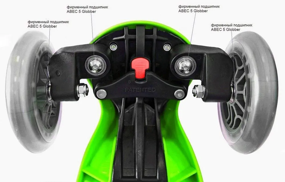 Колеса изготовлены из качественного полиуретана (передние 120 мм, заднее - 80 мм, жесткость 82А). Платформа имеет низкий профиль, благодаря чему ножки малыша не будут уставать. Дека укреплена тонкой и прочной стальной пластиной, резиновые бортики по краям не дадут ноге соскользнуть.