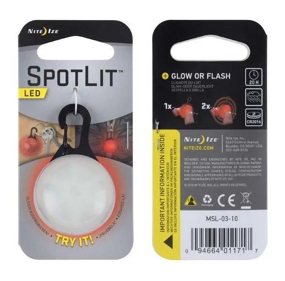 NiteIze SpotLit - светящийся брелок с карабином. В темноте виден с расстояния полутора километров. Ударопрочный и влагозащищенный корпус. Время работы в стандартном режиме: 20 часов., в "мерцающем" режиме: 25 часов.Легко заменяемые 2 х 2016 3V литиевые батареи в комплекте.