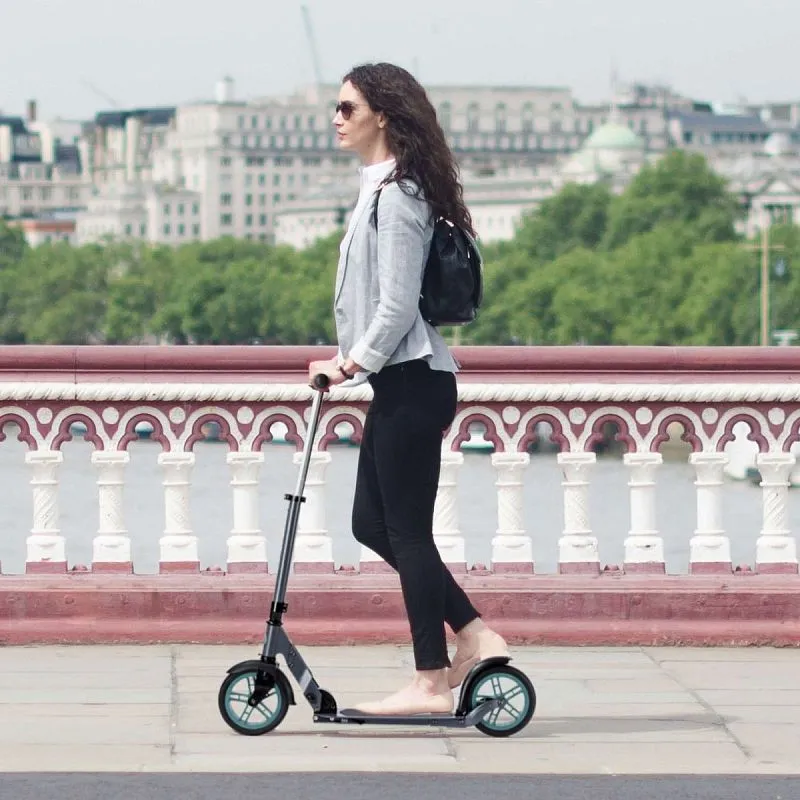 Прежде всего, необходим не слишком большой, но достаточно крупный диаметр колеса – 200 мм. Такой размер позволяет снабдить колесо толстой шиной для хорошей амортизации, не увеличивая существенно его вес и вес всего самоката, в итоге вес Micro Classic составил всего 5 кг. Длина самоката не должна быть избыточна, во избежание задевания днищем деки неровностей даже при её занижении и длина площадки деки у Micro Classic составляет всего 35 см. Для большего комфорта самокат должен иметь развитые крылья – брызговики, что сделано и в этой модели.