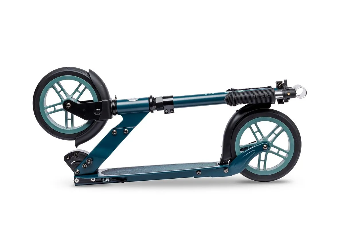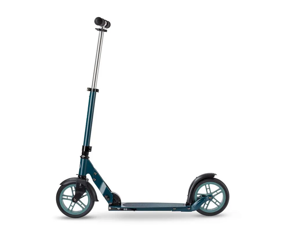 Прежде всего, необходим не слишком большой, но достаточно крупный диаметр колеса – 200 мм. Такой размер позволяет снабдить колесо толстой шиной для хорошей амортизации, не увеличивая существенно его вес и вес всего самоката, в итоге вес Micro Classic составил всего 5 кг. Длина самоката не должна быть избыточна, во избежание задевания днищем деки неровностей даже при её занижении и длина площадки деки у Micro Classic составляет всего 35 см. Для большего комфорта самокат должен иметь развитые крылья – брызговики, что сделано и в этой модели.