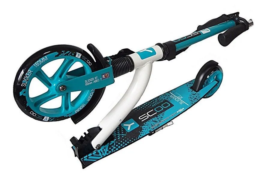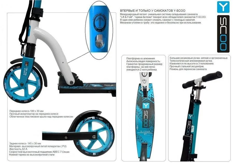 Y-scoo Slicker 180 - компактный самокат для детей старше 6 лет и взрослых. Установлена простая и надежная система раскладывания путем нажатия и поднятия кнопки-паза внутри трубы. Переднее колесо большего диаметра (180 мм.), заднее колесо 145 мм.