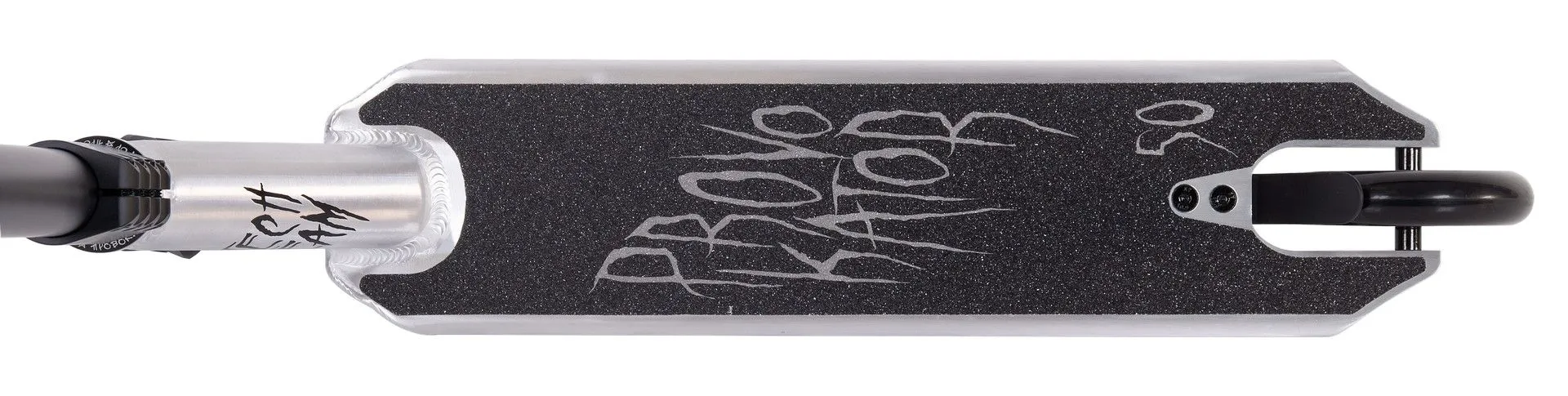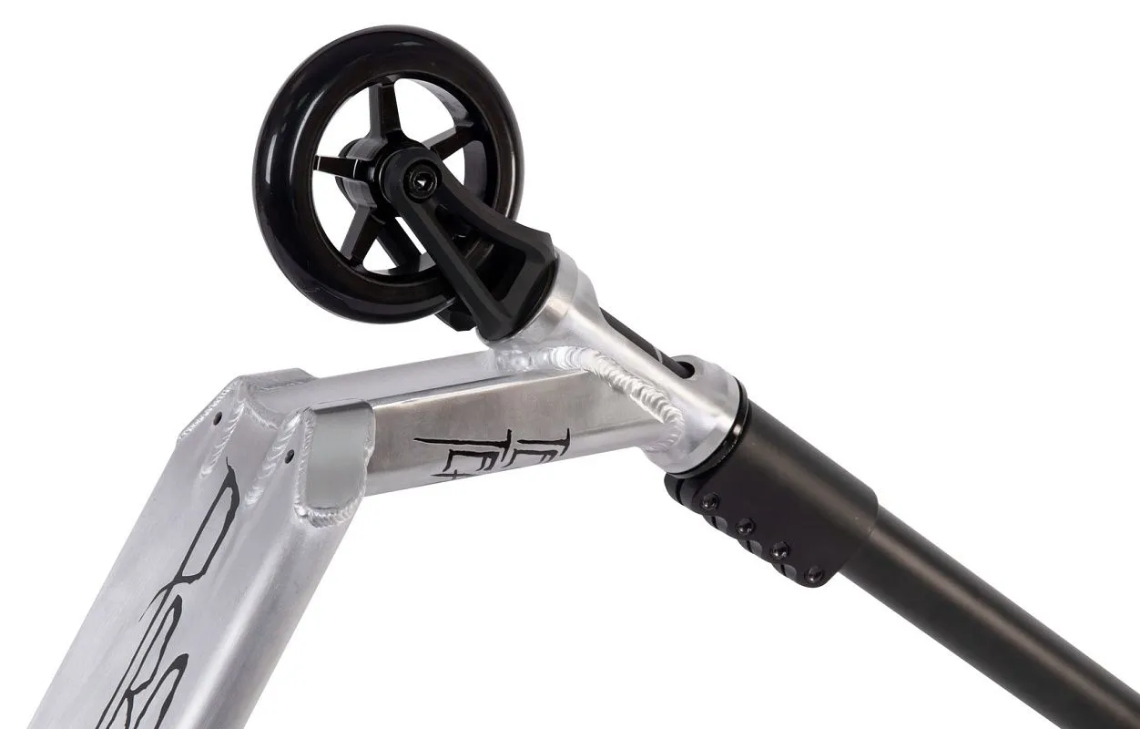 Дека классических для юных райдеров габаритов 49.5x12 см из алюминия 6061. Имеет плоское дно, скруглённые края и стальной тормоз. Вилка фрезерованная, облегченная из алюминия 7 тысячной серии под стандартные колёса 110x24 мм.