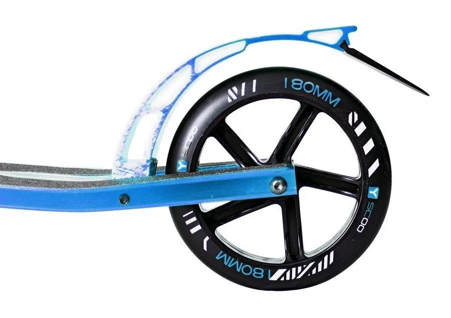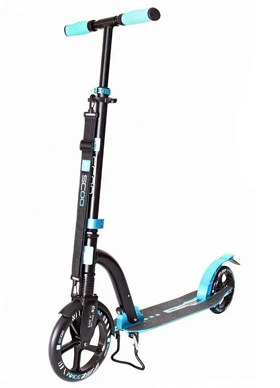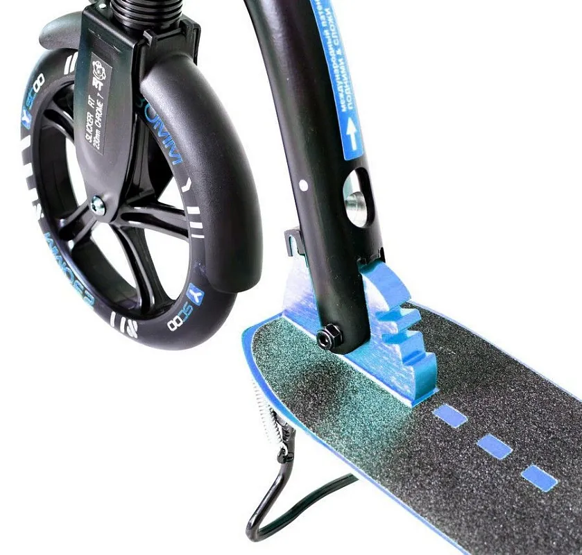 Колёса: переднее 230мм и заднее 180 мм. Жёсткость 82А. На самокате установлен передний амортизатор. В комплекте ремень для переноски, подножка. Оснащен системой быстрого складывания "Lift and Fold" - нужно просто потянуть вверх кнопку-паз в передней части самоката и наклонить руль к заднему колесу, после чего он зафиксируется в этом положении. Механизм утоплен в трубу- это надежно и безопасно при использовании.