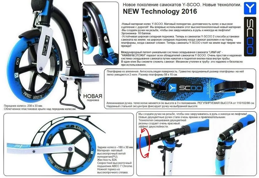 Y-scoo Slicker 230 Slicker new Technology Blue - новое поколение самокатов от Y-scoo. Это ремейк одной из самых удачных моделей y-scoo - Slicker 230 Deluxe, который был существенно улучшен: