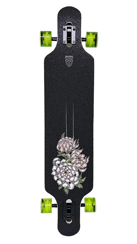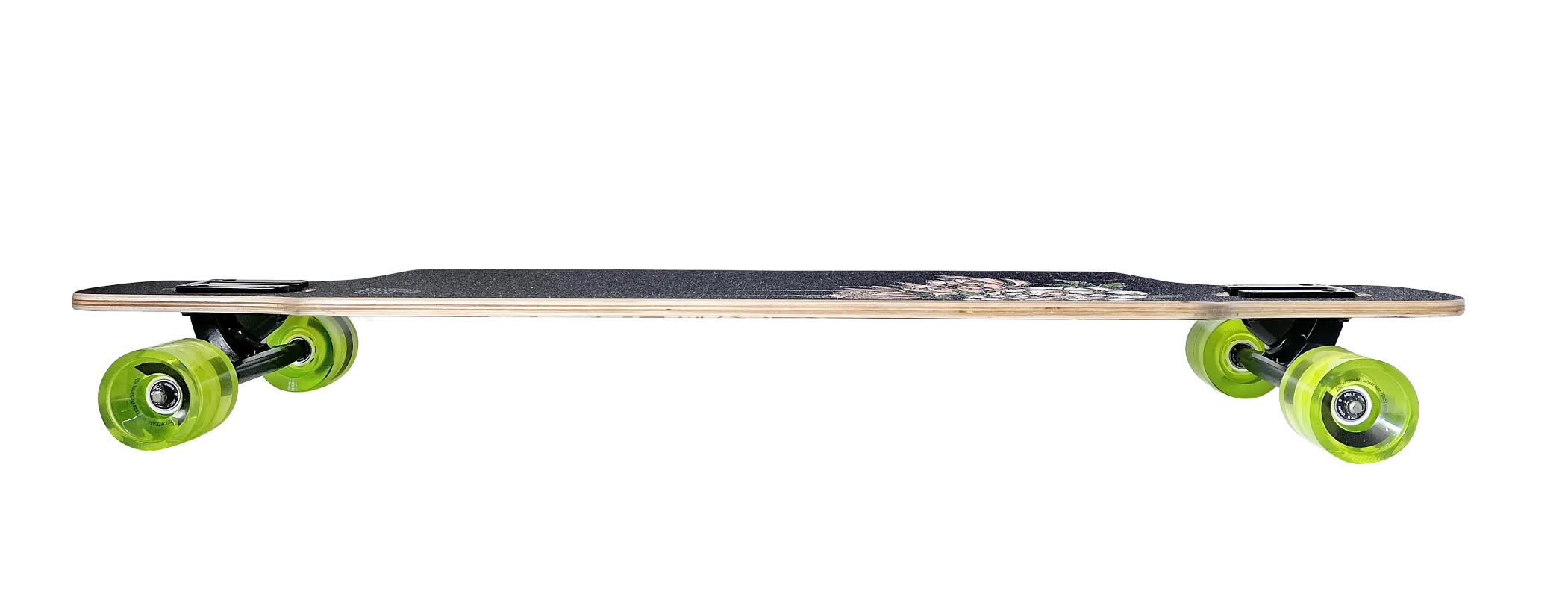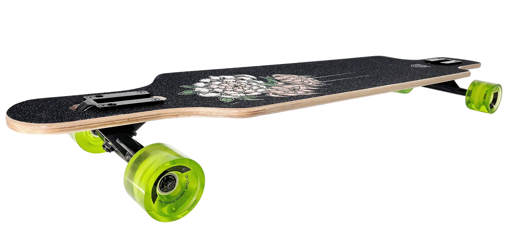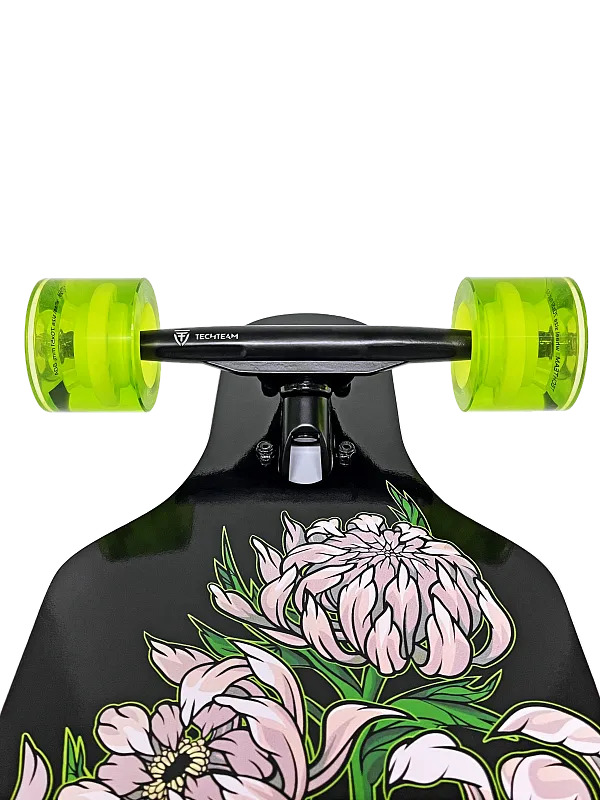 Дека лонгборда имеет размер 41” х 9” (104 х 229 мм) и выполнена из 9 слоёв русского клёна. Благодаря низкому поперечному конкейву, доска дарит свободу выбора стойки и сохраняет отличную манёвренность на любой скорости. Это идеальный выбор для круизинга по незнакомым маршрутам и размеренных покатушек в парке.