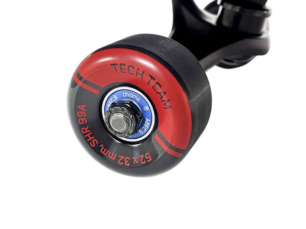 Колёса: 52×32 мм, жёсткость 99А. Это уже не «новичковые» 90А. 99А — максимальный контроль для парка и скольжений (слайдов). Такая жёсткость не амортизирует шероховатости асфальта (будет шумно и тряско на грубом покрытии), зато колёса не «схлопываются» при мощных пушах.