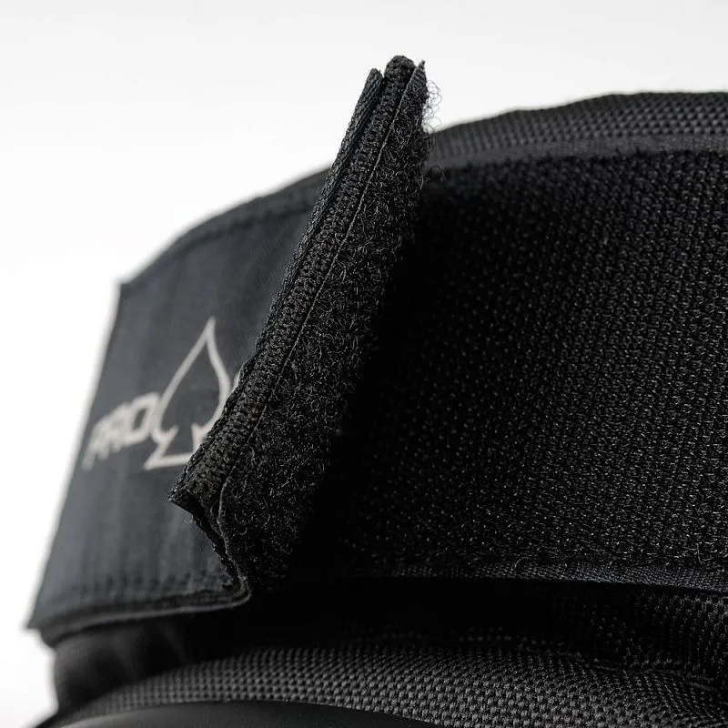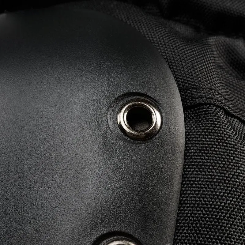 Отлично фиксируется на колене благодаря большому чулку. Дополнительно затягиваются эластичным ремешком сверху и жестким ремнём снизу. Чашка приклёпана. Под ней находится толстый слой ударогасящего материала.