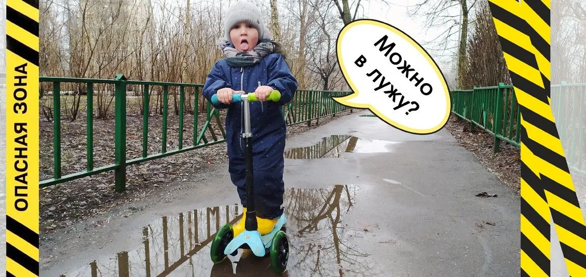 Камни и ямы в мутной воде не видны. Поэтому, ребенку точно не стоит на всей скорости влетать в первую же попавшуюся лужу. Исследуйте её вместе, палкой или с помощью того же самоката и принимайте решение!